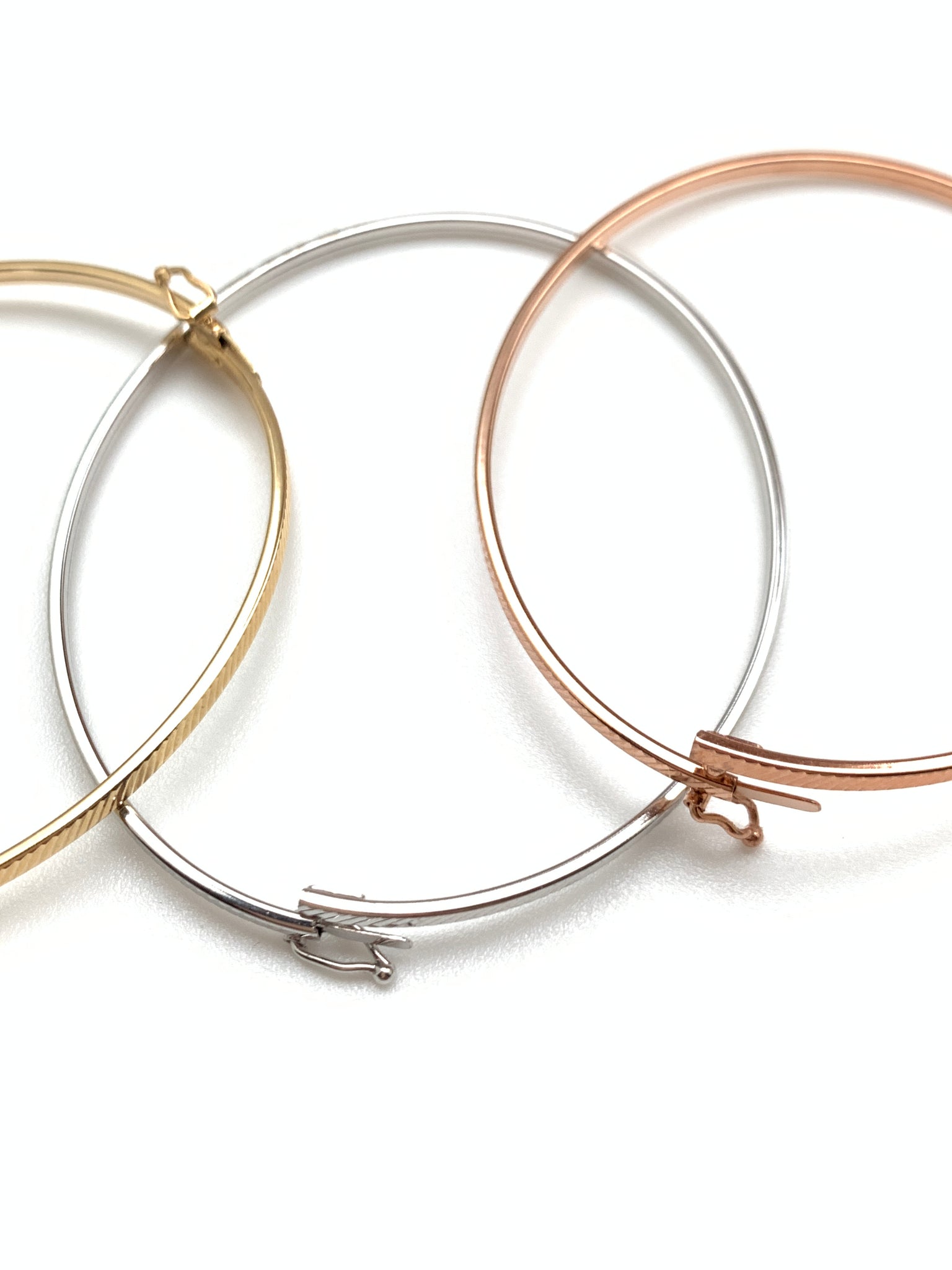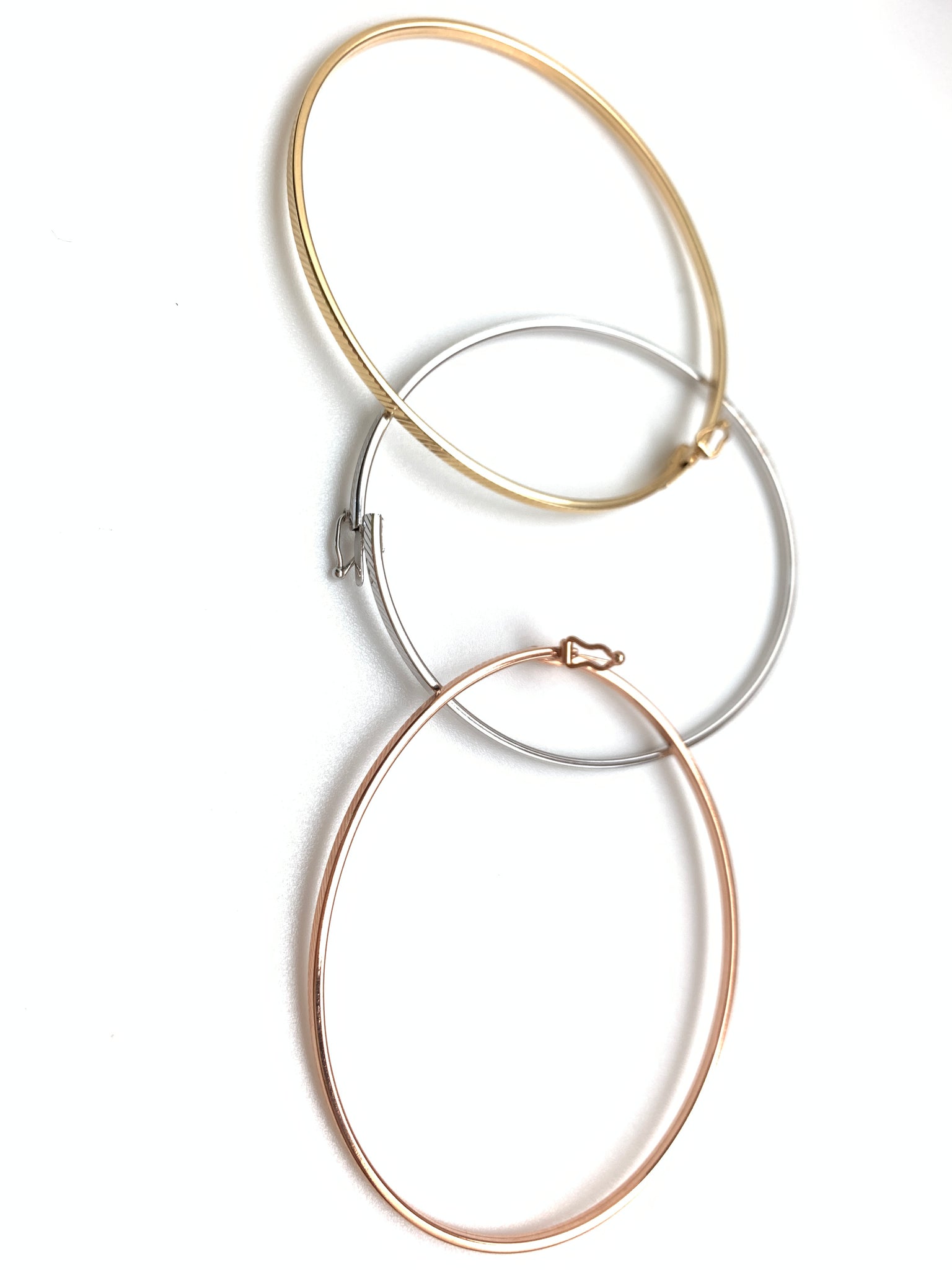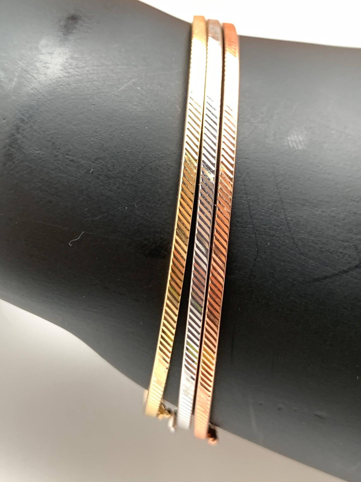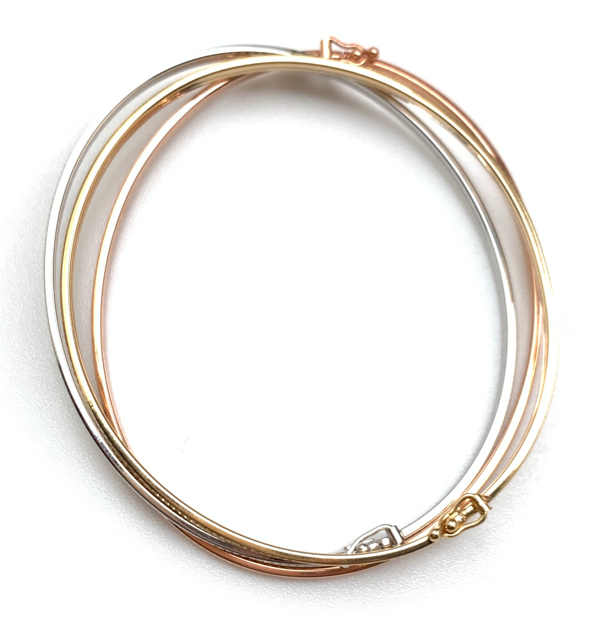 New Real 18K Saudi Gold Oval Oblong Bracelets/Bangles Three Tones White/Rose/Yellow Gold. Comes with jewelry gift box or jewelry pouch.